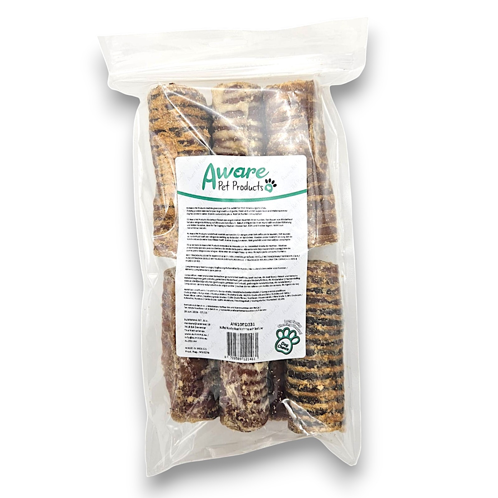 De vulling is een combinatie van 85% gemalen runderhuid, 15% lever. De runderluchtpijp zit bomvol gemalen onderhuids bindweefsel, dat het gebit van je hond reinigt tijdens het kauwen. De productie heeft een FSSC 22000 certificering. Zo weet je dat je de beste kwaliteit koopt.